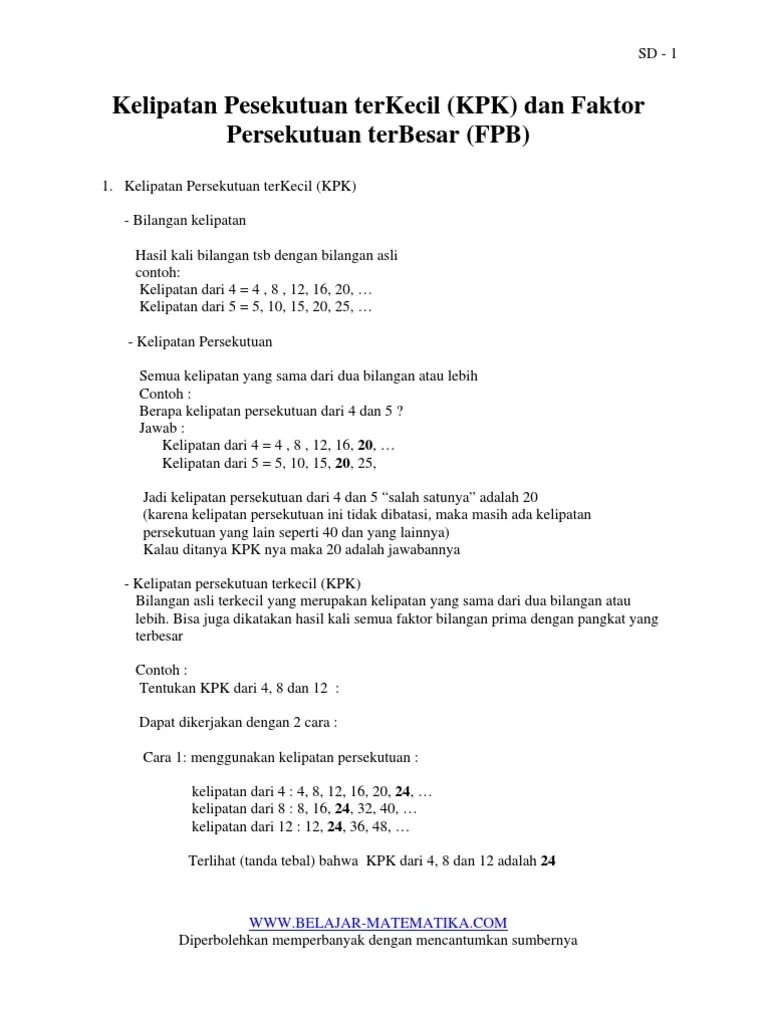 kpk adalah nilai terkecil dari kelipatan persekutuan 2 atau lebih bilangan. Faktorisasi prima dari 60 adalah faktorisasi prima dari 40 adalah. Pada contoh 13, telah ditunjukkan bahwa $(36,128)=4$. dan 15 caranya untuk menghitung fpb pecahan desimal kita jadikan bilangan bulat lebih dulu dengan mengalikannya dengan. Setelah diketahui terdapat 2 bilangan faktor yaitu 2 dan 3.